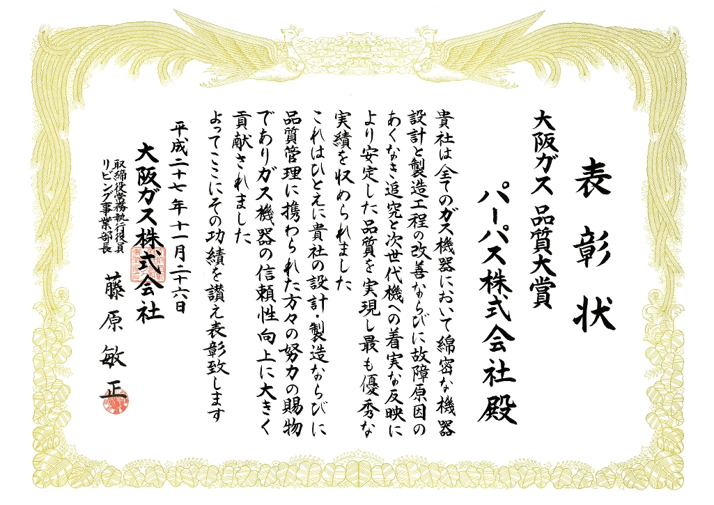 2017年荣获大阪燃气公司举办的“天然气产品大赛奖”